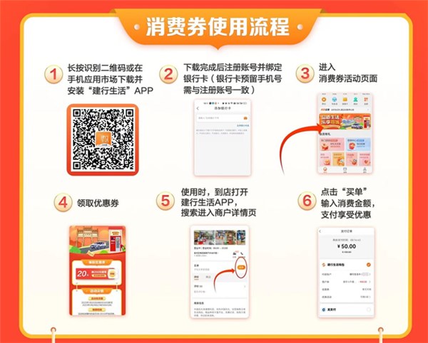 活动内容:本次活动共发放30万元成品油消费券,消费券面值为20元,一次性发放15000张消费券。消费者通过“建行生活”APP领取,活动期间每个消费者限领一张,先领先得,领完即止。
