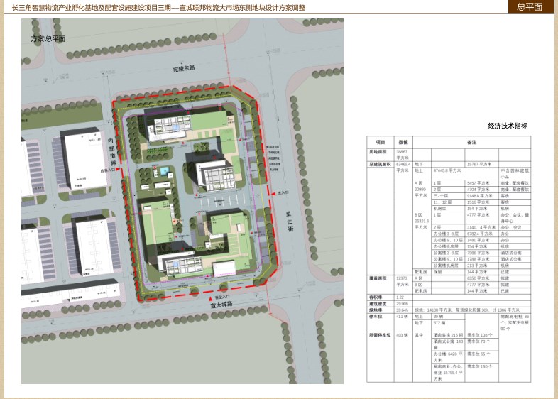 长三角智慧物流产业孵化基地基础及配套建设项目三期地块规划净用地面积3.89公顷,为宣城联邦物流大市场东侧地块,原规划建设内容为海关监管库及配套办公用房,后因海关办公用房及综合保税区选址位置调整,该地块一直闲置未用。为妥善解决闲置土地,在宣城现代服务业管委会的支持下,由下属国有公司东部新城投资发展有限公司收购该地块不动产权,并通过政府专项债项目,重新启动该地块建设,为周边地块物流产业孵化基地做商业配套,主要建设办公、公寓、酒店、配套商业为一体的综合体。地块规划条件要求:规划净用地面积约3.89公顷,用地性质为商业用地,容积率不大于1.5,建筑密度不大于40%,绿地率不小于20%。